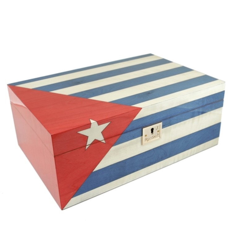 An exceptionally designed humidor for your Cuban cigar collection! Cuban flag design made from real wood, stained in vibrant colours, then laser cut and hand inlaid.