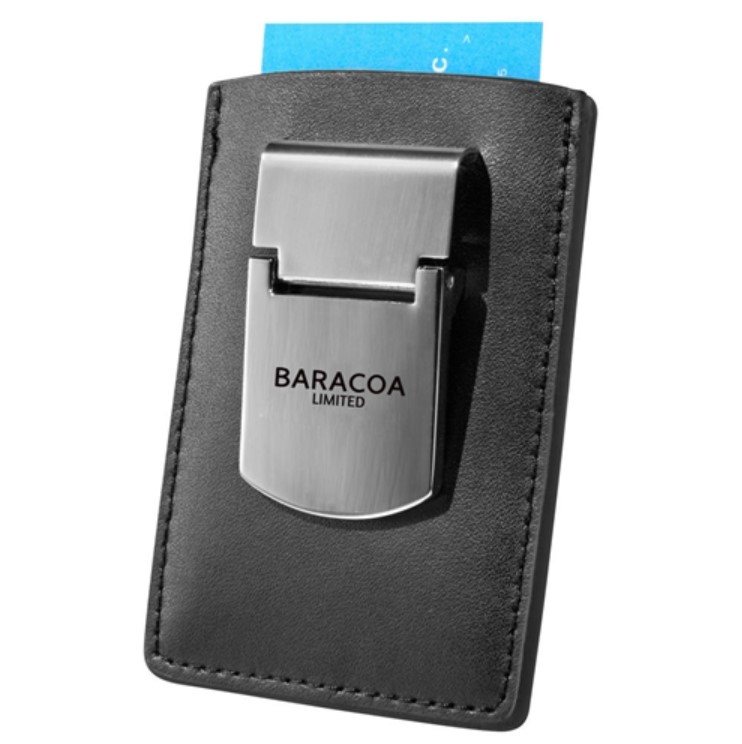 Polished metal clip holds loose bills. Pocket holds cards and notes.